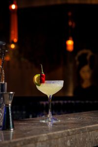 Tequila, Orange liqueur, Lime juice, Tabasco. Salted rim....
